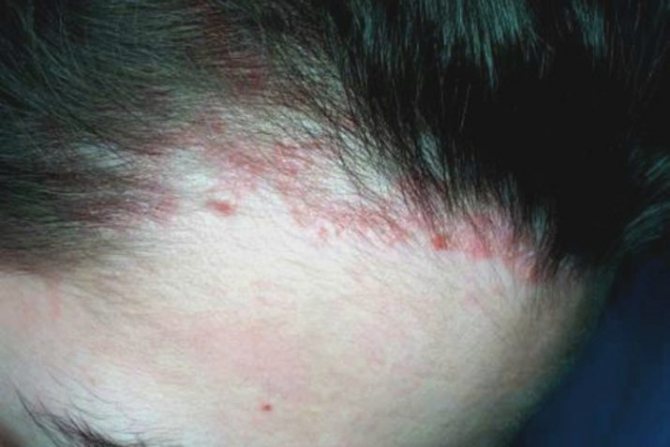 - высыпания от мелких прыщей до больших волдырей не только на волосяной части головы, но и на лице;