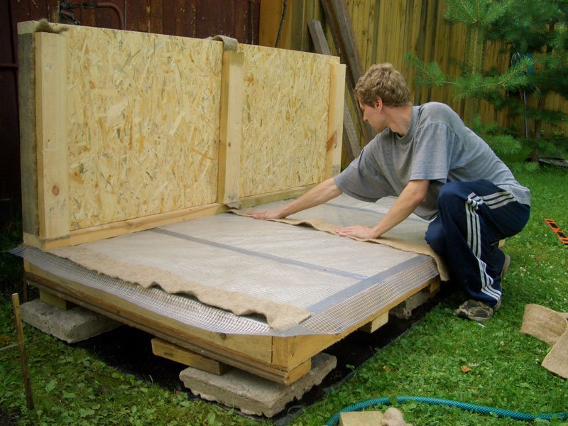 Пол представляет собой конструкцию из брусьев, на которые уложены деревянные доски. На них сверху устанавливается каркас из четырех палок: две длинные и две короткие (размером 10-12 см).