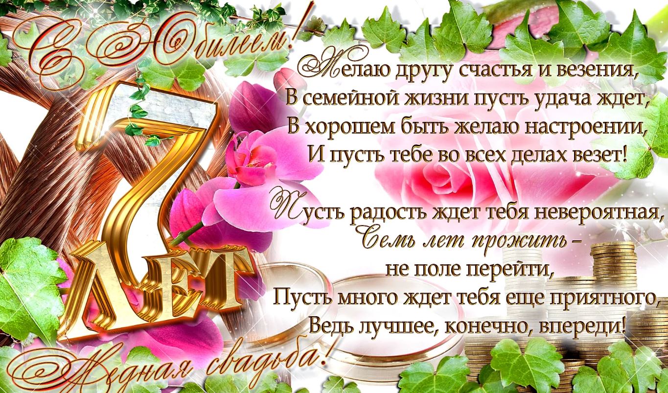 «Дорогие, поздравляем вас с годовщиной свадьбы! Семь лет, пройденных вместе, — это уже значимый путь. Продолжайте любить, уважать и понимать друг друга. Будьте опорой и поддержкой друг для друга. Пусть в вашем доме царят счастье, уют и спокойствие. Желаем здоровья и благополучия!»