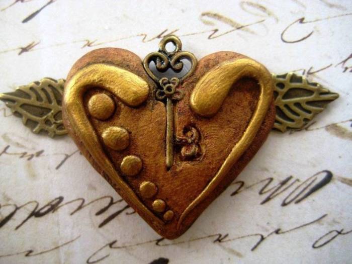 - Медная статуэтка в форме сердца с замочной скважиной и ключом.