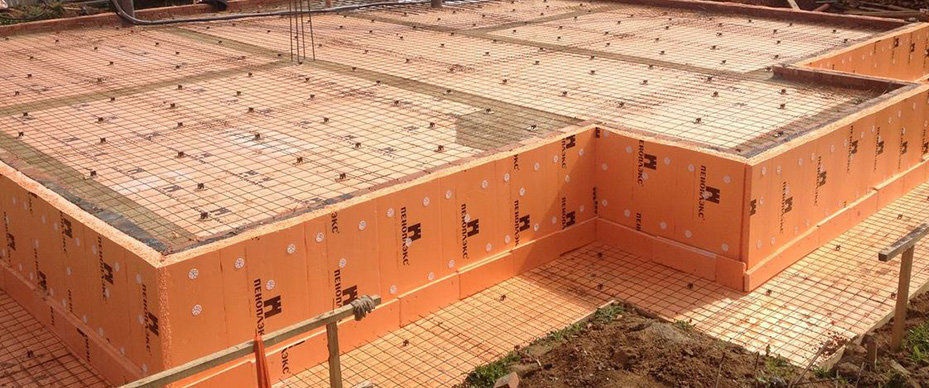 - Плитный фундамент — в этом случае сначала укладывают гидроизоляцию, затем пенополистирол в несколько слоев, после чего устанавливают армирующий каркас.